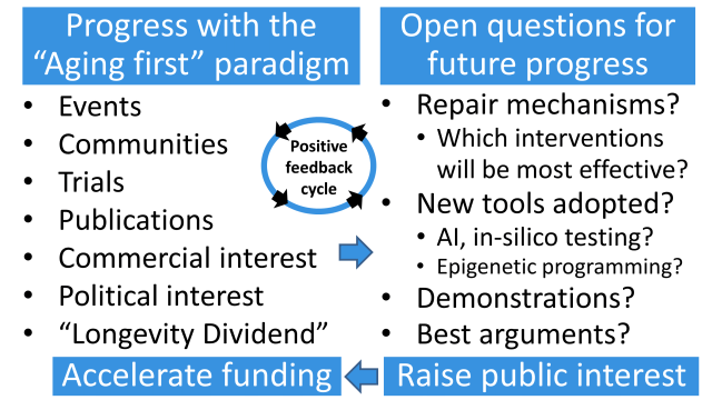 Something I’ll be talking about at that meeting is the progress that is taking place in what I see as a paradigm change between the mainstream “disease-first” model of medicine and the emerging new “aging-first” model.