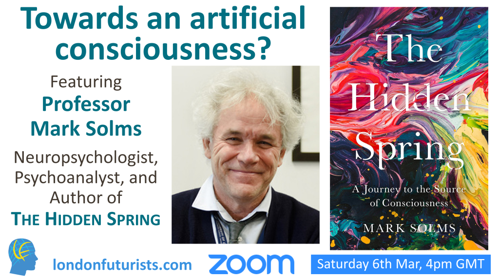His recent book, “The Hidden Spring: A Journey to the Source of Consciousness”, has been widely acclaimed. Mark will be joining us on Saturday 6th March to reviewe the implications of his ideas for artificial consciousness.
