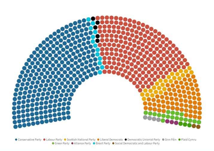 The graph above shows how the current UK parliament would look after the 2019 election if proportional representation rather than first past the post voting system had been used.