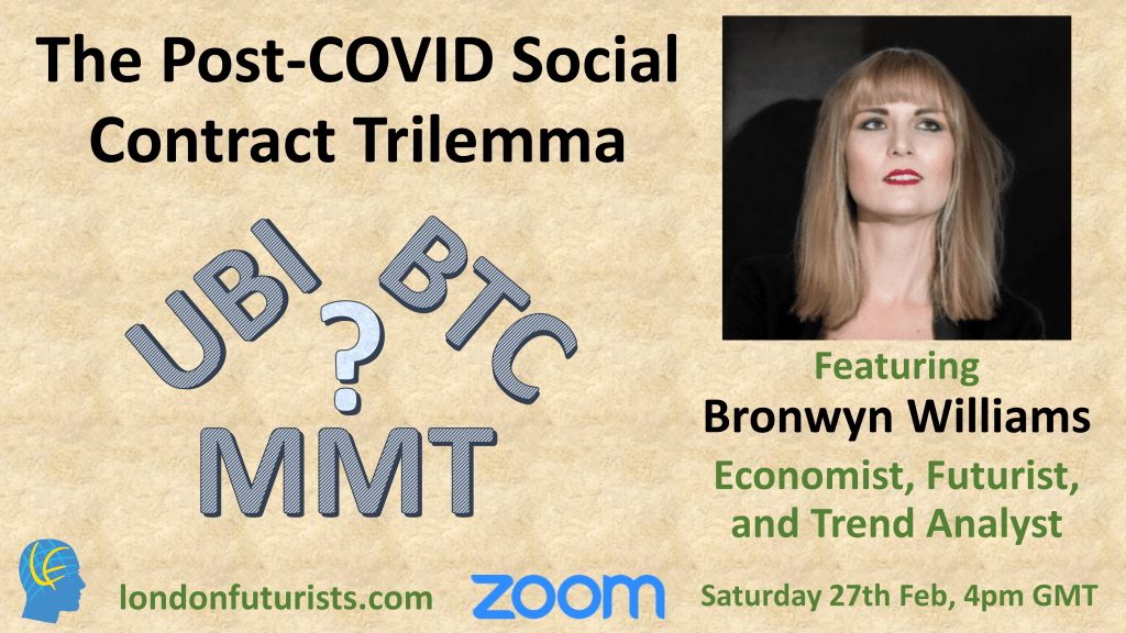 This London Futurists webinar features Bronwyn Williams, economist, futurist, and business trend analyst. Bronwyn will be drawing attention to a growing “trilemma” of choice, highlighting potential contradictions between, for example: