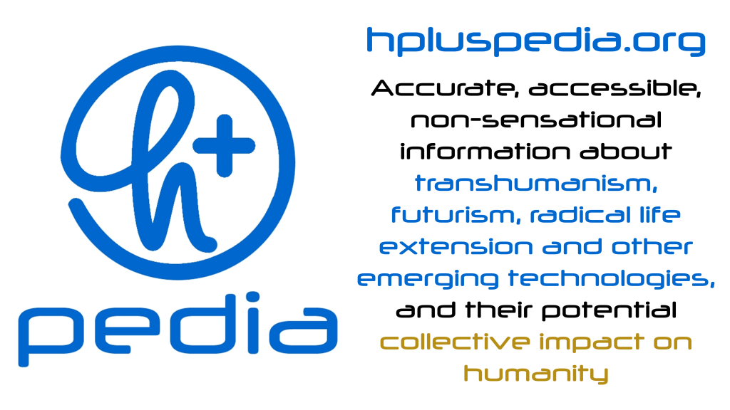 As a reminder, H+Pedia is a project to spread accurate, accessible, non-sensational information about transhumanism, futurism, radical life extension and other emerging technologies, and their potential collective impact on humanity. H+Pedia operates similarly to Wikipedia – and uses the same underlying software – but shows more awareness and appreciation of material which might not pass the Wikipedia tests for notability, as currently applied by Wikipedia editors.
