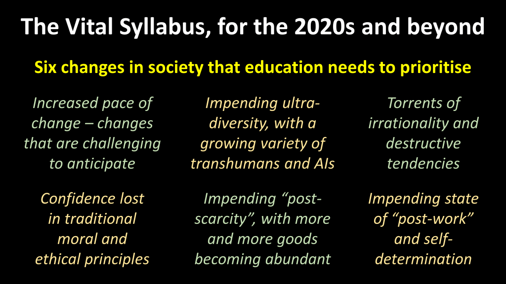 The Vital Syllabus project, currently hosted on the London Futurists website, aims to answer these questions. The project aims, moreover, to draw attention to resources that can best assist students of all ages: