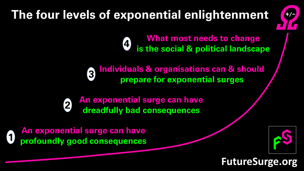 The recently launched organisation Future Surge refers to “four levels of exponential enlightenment” – namely four ways of being aware of the implications and possibilities of exponential changes: