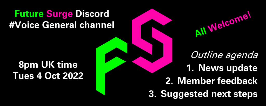 The very latest news from Future Surge covers “three weeks of progress” and also contains an invite to an online audio (voice) meeting starting at 8pm UK time on Tuesday 4th October. Click on the following image to read that news posting.
