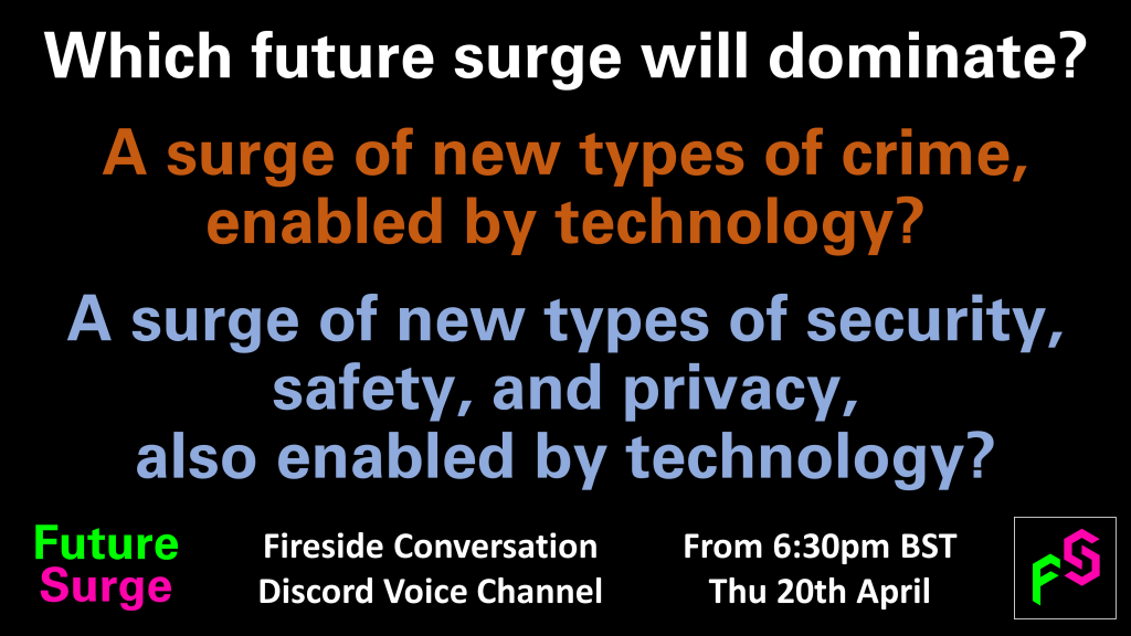 For those of you keen to take part in online discussions of futurist topics, let me mention the Fireside Conversation that will be taking place on the Future Surge Discord Voice Channel tomorrow (20th April).