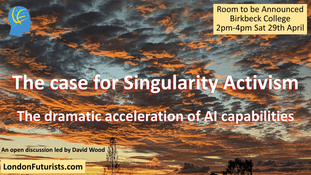 I hesitate to say London Futurists is “returning to normal”, since the world in April 2023 is different in so many ways from the world in February 2020.