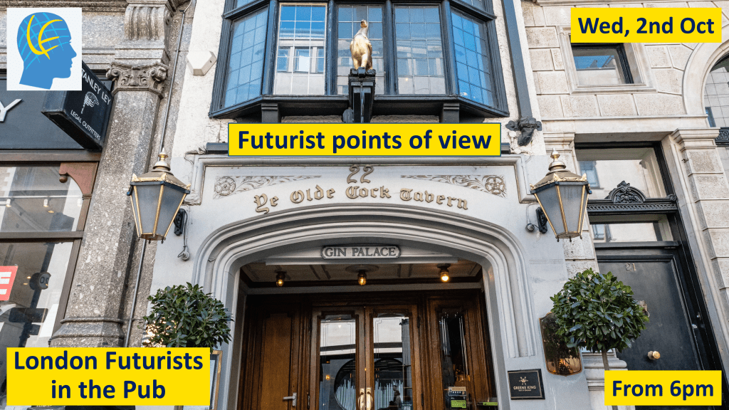 The next seven days provide us with not one but two opportunities to exchange and debate ideas and insights about future possibilities. Tomorrow, there’s a chance to gather online, in a new platform called Ploutos, to review potential future scenarios regarding fake news. And on Wednesday next week, there’s a chance for people in or near London to gather offline in a pub which was founded way back in 1549.