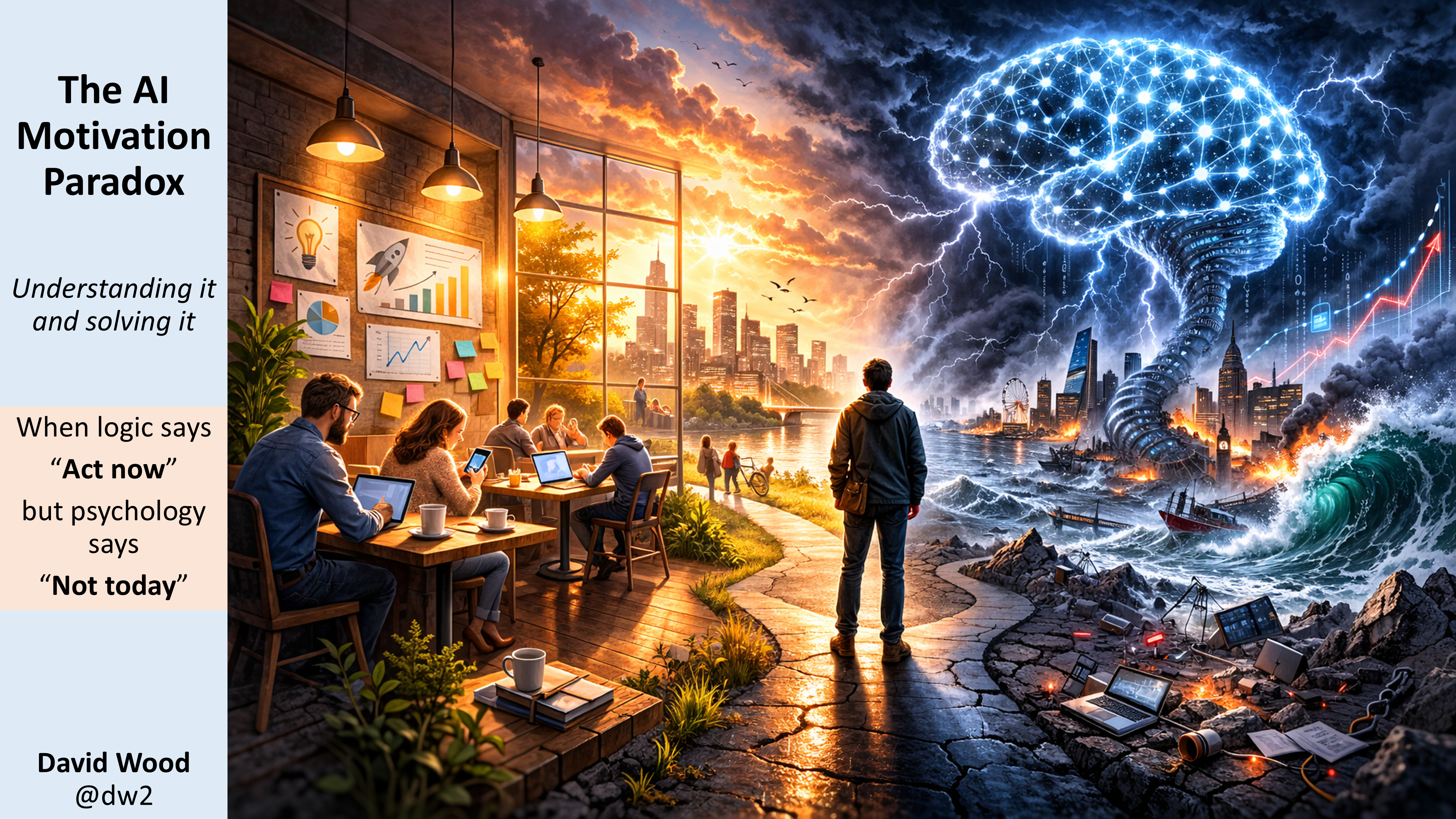 This is not primarily a failure of logic. It is a matter of psychology and sociology. Across business, public policy, and personal life, we humans are notoriously poor at recognising and responding to systemic catastrophic risks. Major change initiatives frequently falter – not because the evidence is weak, but because inertia, status-quo bias, fragmented incentives, and social conformity blunt our response. Even when risks are grave, disruption to familiar routines can feel more threatening than the danger itself. We prefer to say to each other, Don’t look up!